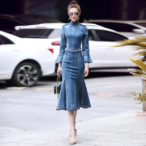 Women’s Blue Denim Dressslim Fitted Midi Dressstretchy Etsy